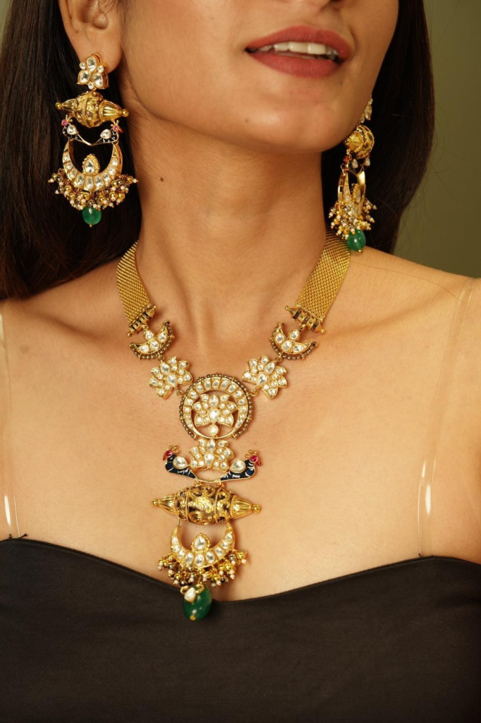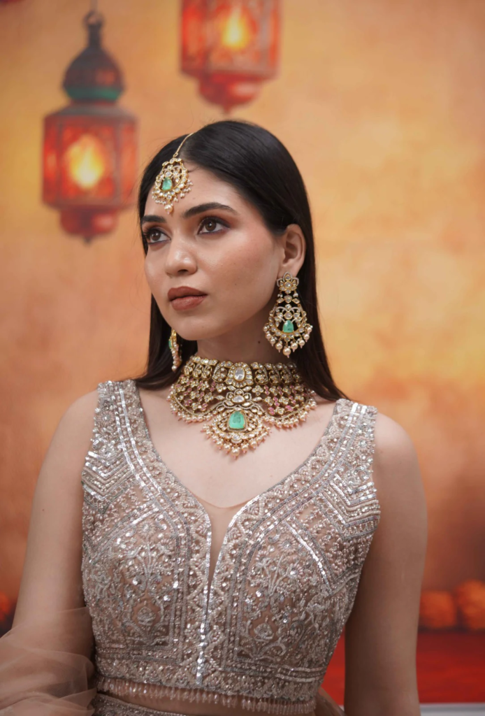A royal bridal set that blends traditional craftsmanship with modern brilliance. Handcrafted with Polki and Moissanite stones, it adds grandeur to festive and bridal looks.