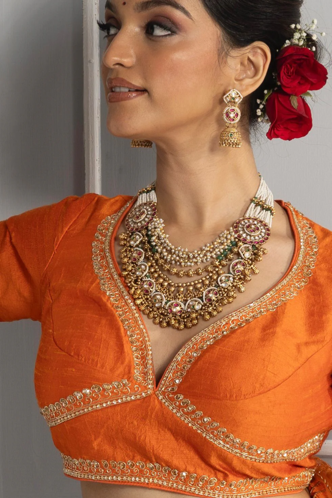 A beautifully layered gold set that exudes old-world charm. Ideal for Lohri or Makar Sankranti celebrations, bringing a perfect balance of tradition and style.