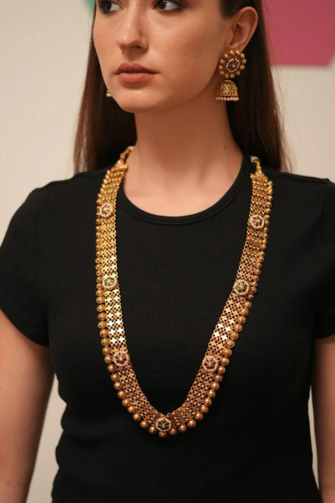 An elegant long haar paired with traditional jhumkis, designed to add heritage-inspired grace to your festive wardrobe.