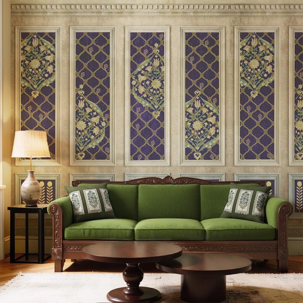 New additions include Anant Vriksha, a “Tree of Life” Kalamkari mural; Shiv Shakti, a large-format devotional mural; Colors of India, drawing from palace leopard imagery and Mughal garden motifs; and The Quilted Village, a folk landscape in the narrative painting tradition. The collection also includes a dedicated range for real-time inspiration, featuring designs such as Kashmiriyat, Royal Bagh (in cream, ochre, and blue), and the Mayura peacock mural, inspired by traditional shawls and carpets.