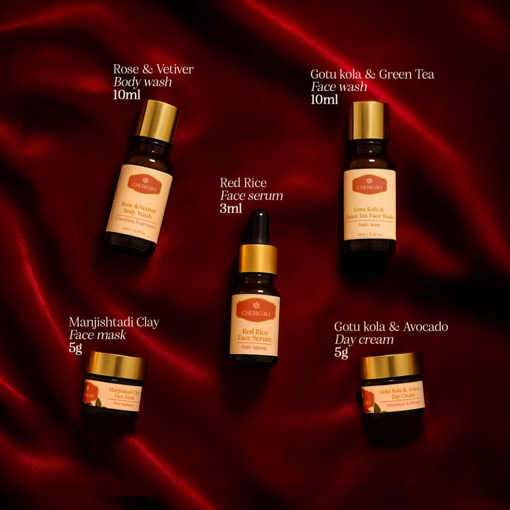 Nestled inside are five of Chengavi’s most loved essentials: a complete ritual in miniature that cleanses, calms, treats, and restores. Each product is a gentle invitation into Chengavi’s world of balanced skincare, offering a sensory glimpse into textures, aromas, and results that refresh and renew.