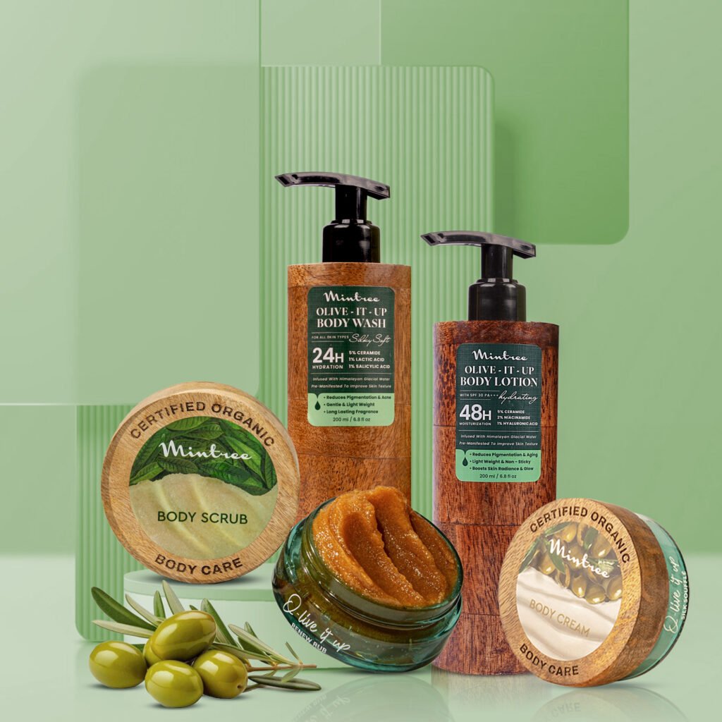Bringing together four nourishing essentials for deeply pampered skin: the Olive Body Wash gently cleanses while hydrating the skin, the Olive Body Butter delivers rich, long-lasting moisture and restores softness; the Olive Body Scrub buffs away dead skin cells to reveal a smoother, more radiant texture; and Peel Appeal, a refreshing skin-renewing treatment, lifts impurities and brightens the skin instantly. Together, they create a luxurious, wholesome ritual for glowing, healthy-looking skin.