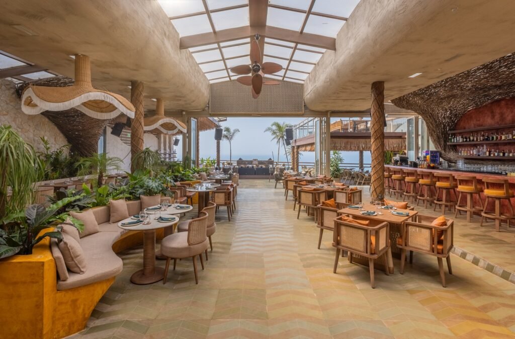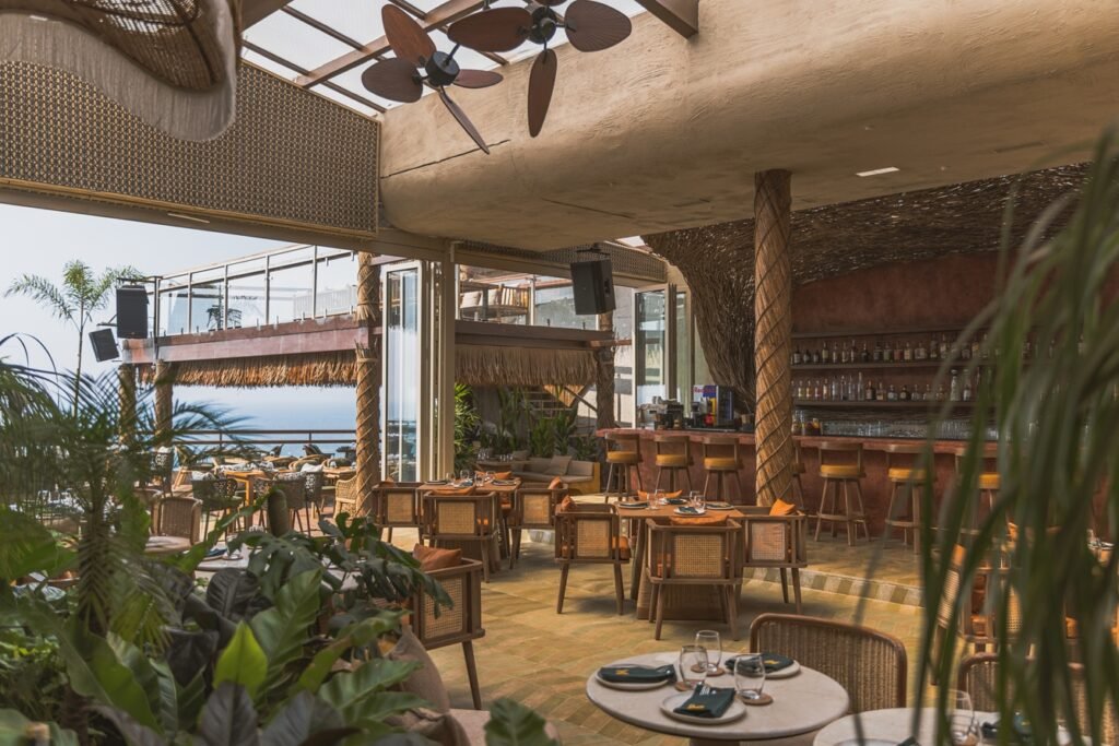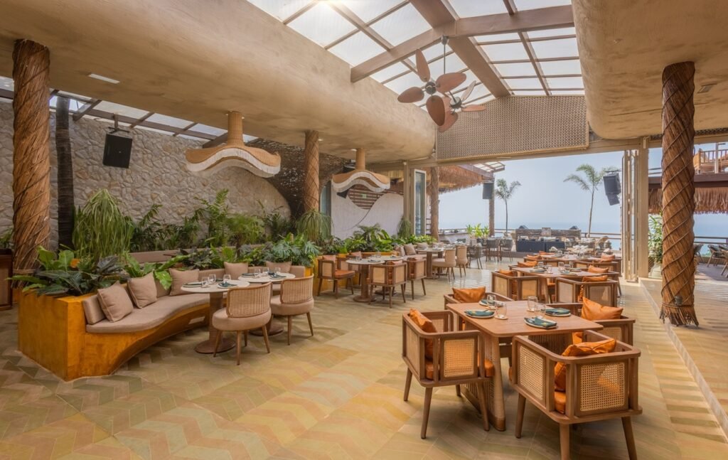 The design builds on Titlie’s iconic cliffside setting overlooking Vagator. Conceived by Studiio Dangg, the dining room opens out towards the sea with terraces and large windows framing the coastline. Warm wood, woven textures and greenery run through the space, while a central bar anchors the room, connecting dining tables, sunset drinks and the dance floor as the energy evolves through the day.