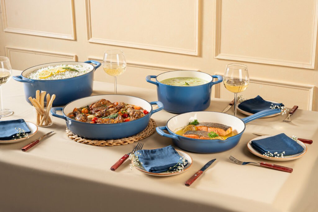 BESTOW is crafted using high-quality cast iron and finished with a durable enamel coating, ensuring superior heat retention and uniform cooking. Ideal for slow braising, roasting, baking, and elegant table service, the collection transitions seamlessly from stovetop to oven to table.